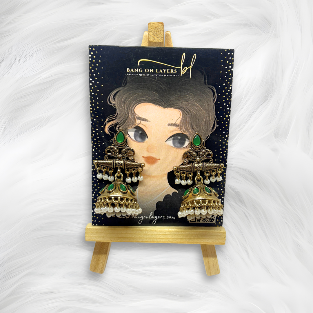 Traditional Antique Gold-Plated Jhumka Earrings for Women & Girls, Green Stone