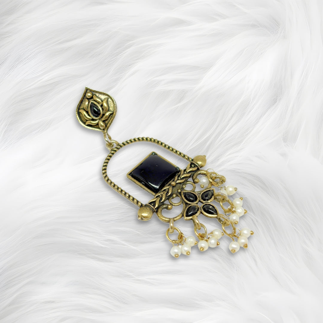 Traditional Black Stone Dangler Earrings for Women – Antique Gold Finish Ethnic Earrings with Pearl Beads for Festive & Wedding